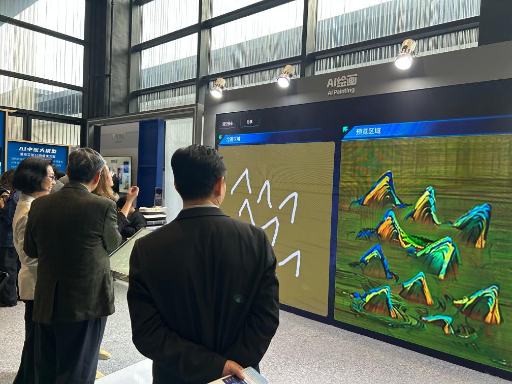 不雅众正在博览会现场体验AI绘画。吸引了665家国表里展商通过线上线下的体例参取。